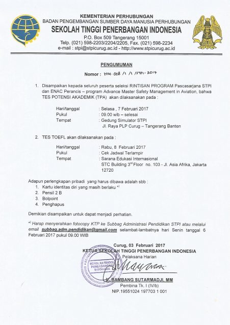 Pada kesempatan ini, Senin 20 Februari 2017, Direktur Keamanan Penerbangan, Direktorat Jenderal Perhubungan Udara, Bapak M. Nasir Usman, S.Si.T, memberi Kuliah Umum kepada seluruh peserta Diklat Aviation Security (Avsec) di Gedung Serba Guna (GSG) Sekolah Tinggi Penerbangan Indonesia (STPI), didampingi oleh Ketua Jurusan Manajemen Penerbangan, Sekolah Tinggi Penerbangan Indonesia, Bapak Andung Luwihono, S.Si.T., ST., MM. […]